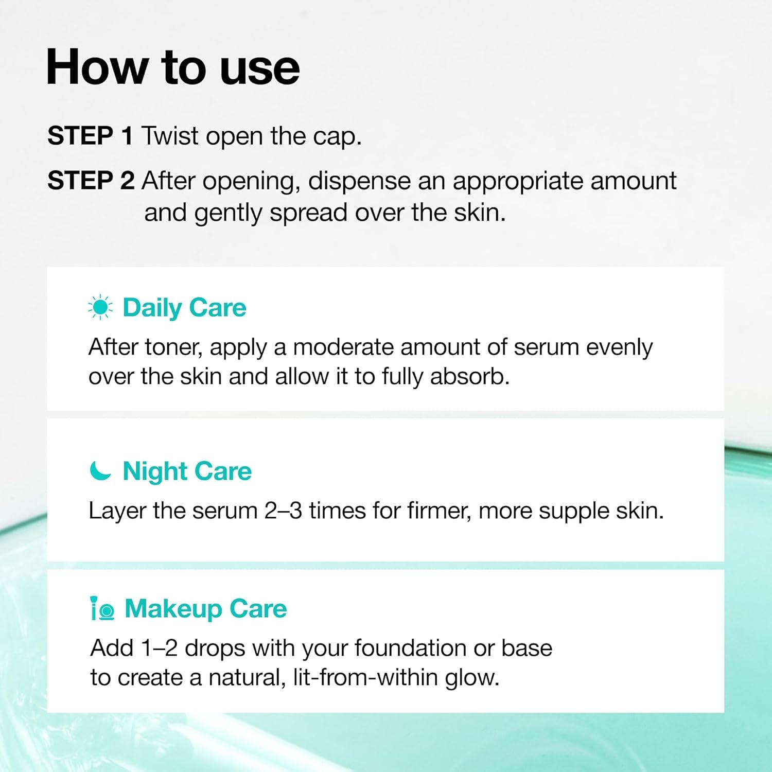 MULTI-USE FOR PERFECT SKINCARE Use after toner as a lightweight serum, layer 2-3 times at night for a skin feel smooth and refreshed after use, or blend into foundation for a glass skin. It isideal for your at-home Korean self-care routine.